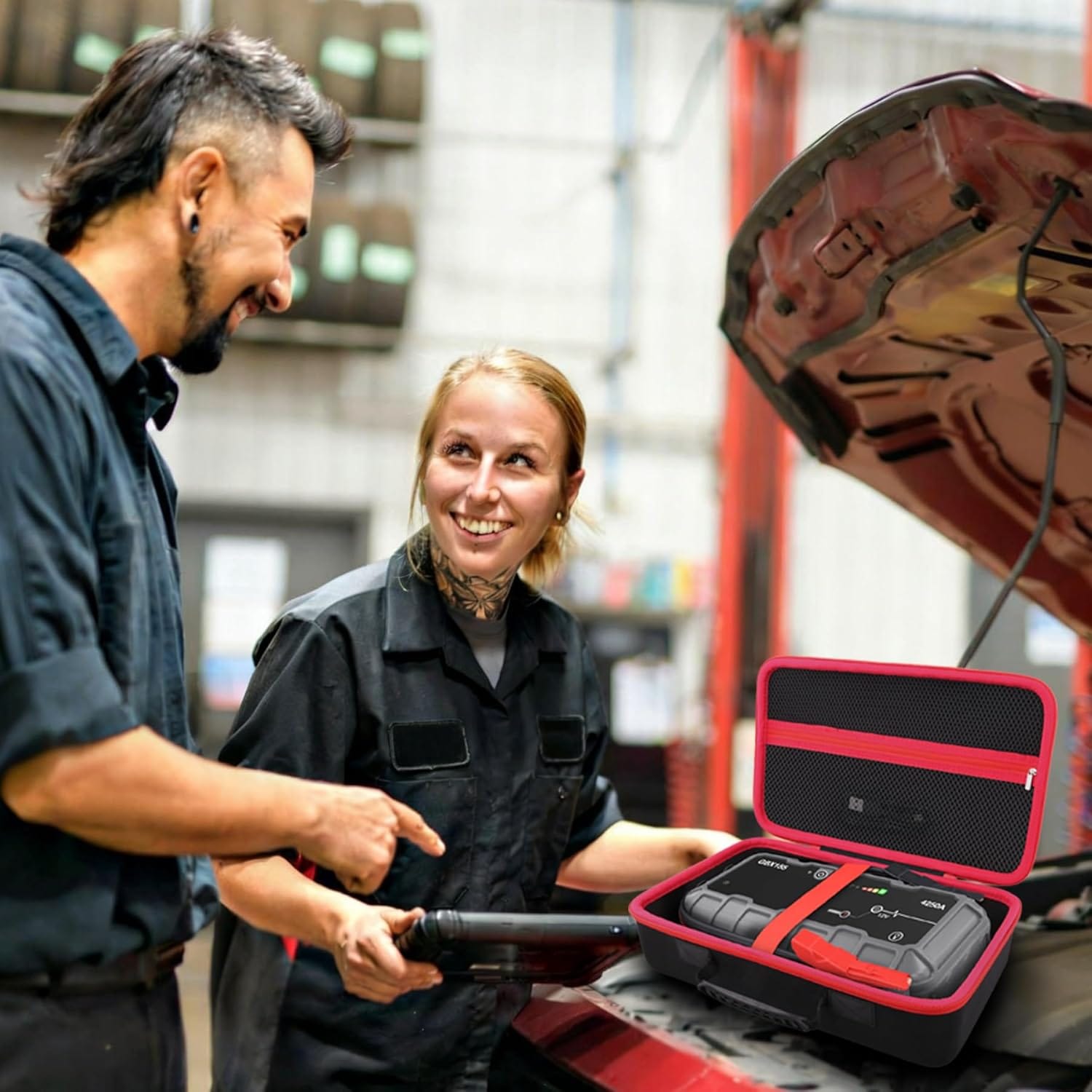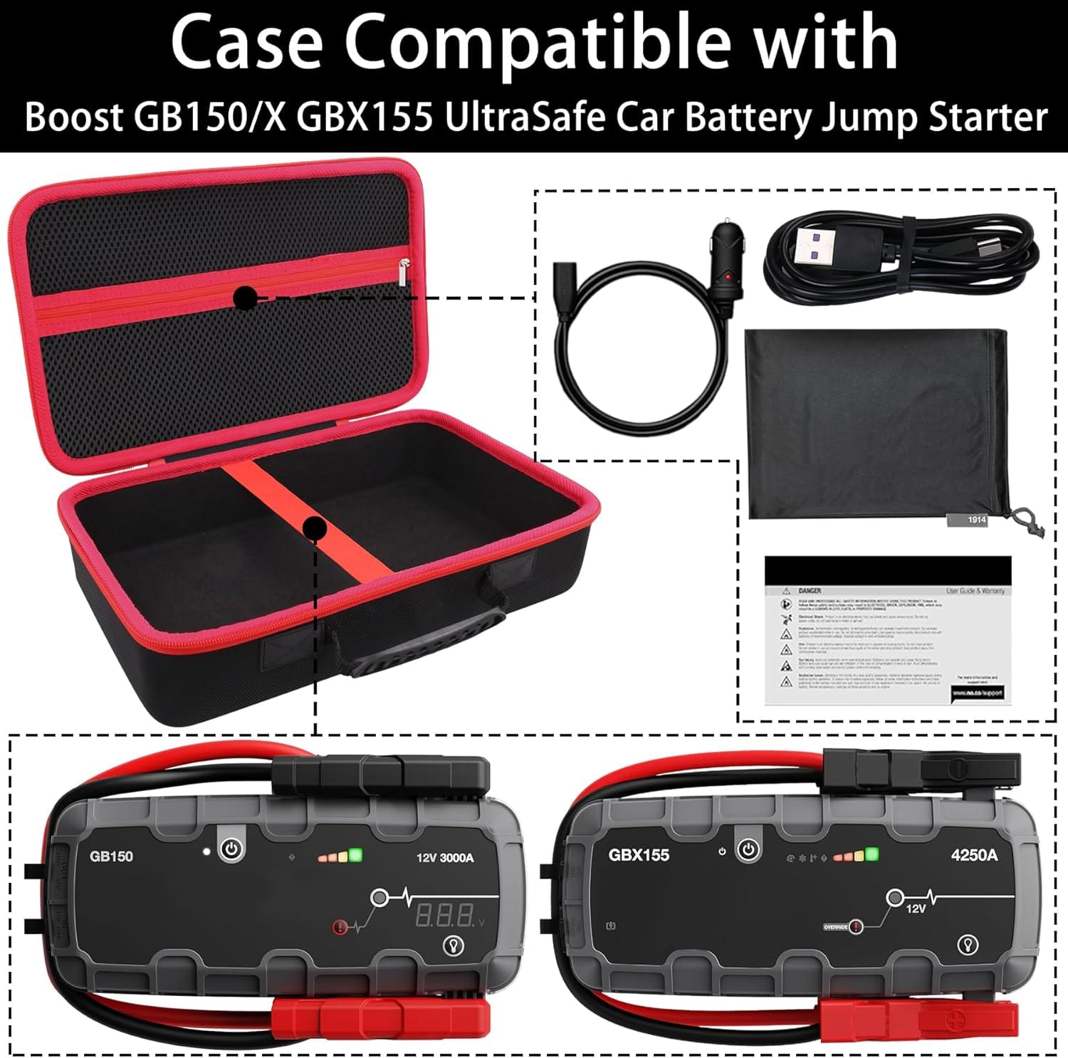 X GBX155 UltraSafe Jump Starter Lithium Battery Booster Pack and Accessories(Black Case + Red Zipper)